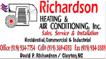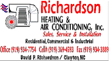 We love our customers, so feel free to drop by or give us a call at 919-934-7754, or email us at richardsonhvac@live.com when you need service & replacement of your Heating and Air Conditioning Equipment, or need Electrical work done. We are there for you when you need us!